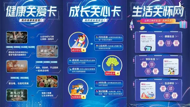 两卡一网”是利用云计算等技术,为员工的身心健康、职业成长和便捷生活构建“两卡一网”智慧服务云平台。“两卡一网”包括“员工健康关爱卡”“员工成长关心卡”和“员工生活关怀网”。其中,“员工健康关爱卡”通过体检档案管理、运动打卡积分、营养指导等为员工提供个性化健康指导,系统管理身心状态;“员工成长关心卡”通过闪光足迹、成长树、HR头条等记录员工职业成长历程,帮助员工明晰职业生涯发展方向;“员工生活关怀网”以品质生活为始点,通过特惠商超、线上菜篮子工程、协会趣吧、困难帮扶等,让员工生活更加便捷、更加实惠、更加快乐。